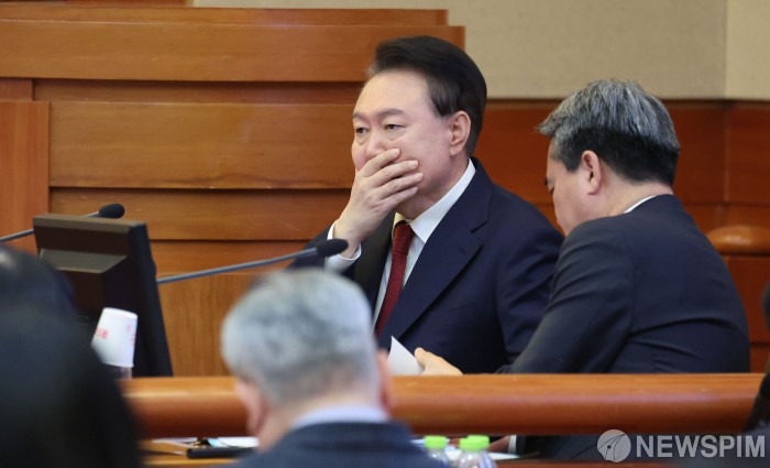 [서울=뉴스핌] 사진공동취재단 = 윤석열 대통령이 6일 서울 종로구 헌법재판소 대심판정에서 열린 탄핵 심판 6차 변론에 출석해 있다.2025.02.06 photo@newspim.com