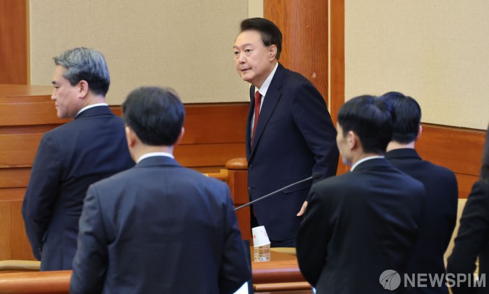 [서울=뉴스핌] 사진공동취재단 =윤석열 대통령이 6일 서울 종로구 헌법재판소 대심판정에서 열린 탄핵 심판 6차 변론에 출석해 착석하고 있다.2025.02.06 photo@newspim.com