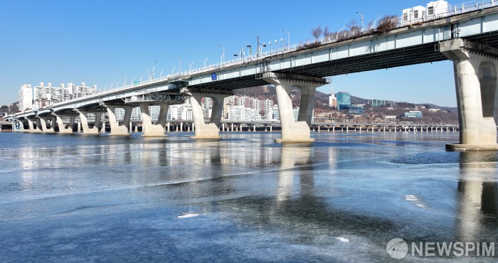 [서울=뉴스핌] 최지환 기자 = 한파가 이어진 6일 오전 서울 송파구 광진교 인근 한강이 얼어있다. 2025.02.06 choipix16@newspim.com