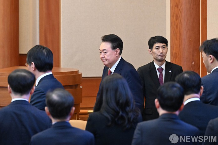 [서울=뉴스핌] 사진공동취재단 = 윤석열 대통령이 11일 서울 종로구 헌법재판소에서 열린 '윤석열 대통령 탄핵심판 7차 변론'에 출석하고 있다. 2025.02.11 photo@newspim.com