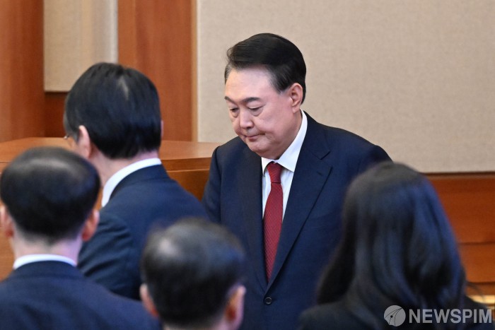 [서울=뉴스핌] 사진공동취재단 = 윤석열 대통령이 11일 서울 종로구 헌법재판소에서 열린 '윤석열 대통령 탄핵심판 7차 변론'에 출석하고 있다. 2025.02.11 photo@newspim.com