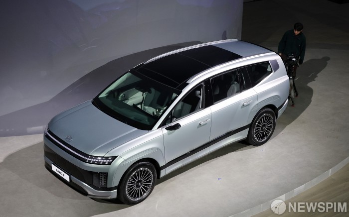 [서울=뉴스핌] 정일구 기자 = 12일 서울 광진구 그랜드 워커힐 서울에서 열린 현대자동차 플래그십 전동화 대형 SUV '아이오닉 9' 미디어 행사에서 신차가 공개되고 있다. 2025.02.13 mironj19@newspim.com