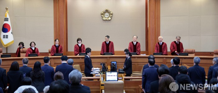 [서울=뉴스핌] 사진공동취재단 = 문형배 헌법재판소장 권한대행과 재판관들이 13일 서울 종로구 헌법재판소에서 열린 '윤석열 대통령 탄핵심판 8차 변론'에 입장하고 있다. 2025.02.13 photo@newspim.com