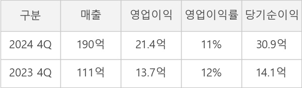 ◆ 4Q 실적, 매출액 190억원 전년동기 대비 71% 증가... 영업이익 57% 증가