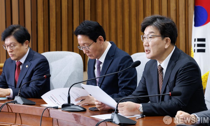[서울=뉴스핌] 윤창빈 기자 = 권성동 국민의힘 워내대표가 18일 오전 서울 여의도 국회에서 열린 원내대책회의에서 모두발언을 하고 있다. 2025.02.18 pangbin@newspim.com