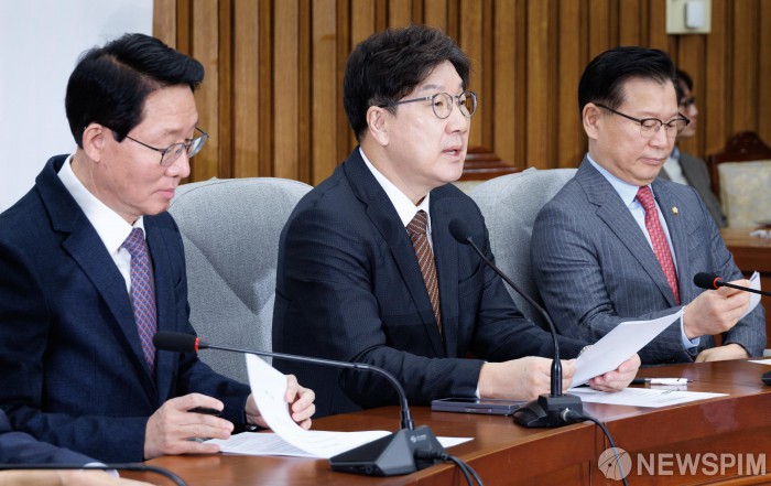 [서울=뉴스핌] 윤창빈 기자 = 권성동 국민의힘 워내대표가 18일 오전 서울 여의도 국회에서 열린 원내대책회의에서 모두발언을 하고 있다. 2025.02.18 pangbin@newspim.com