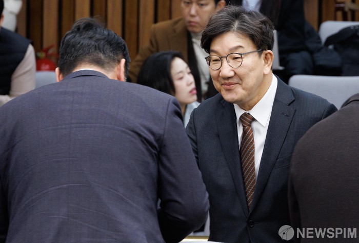 [서울=뉴스핌] 윤창빈 기자 = 권성동 국민의힘 워내대표가 18일 오전 서울 여의도 국회에서 열린 원내대책회의에 참석하고 있다. 2025.02.18 pangbin@newspim.com