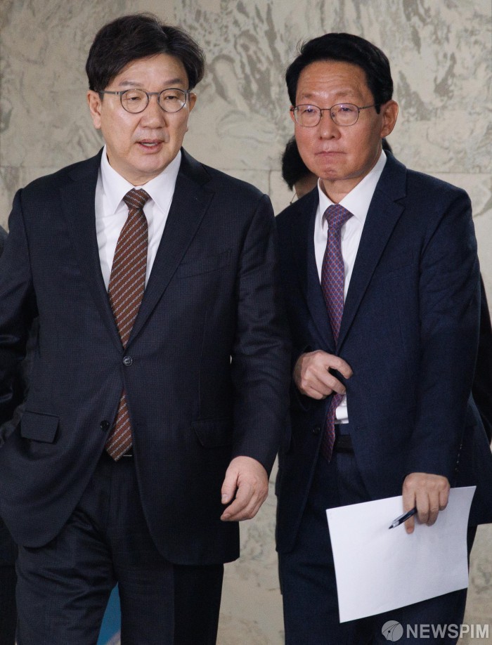 [서울=뉴스핌] 윤창빈 기자 = 권성동 국민의힘 워내대표, 김상훈 정책위의장이 18일 오전 서울 여의도 국회에서 열린 원내대책회의에 참석하고 있다. 2025.02.18 pangbin@newspim.com