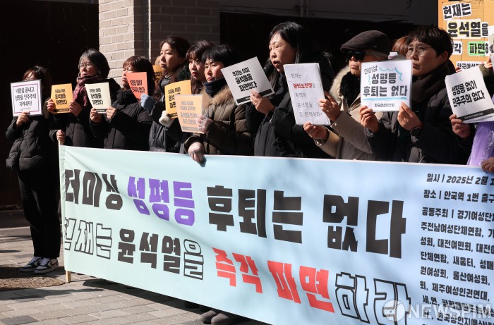 [서울=뉴스핌] 김학선 기자 = 한국여성단체연합 회원들이 18일 서울 종로구 안국역 앞에서 '더이상 성평등 후퇴는 없다. 헌법재판소는 윤석열을 즉각 파면하라' 기자회견을 열고 있다. 2025.02.18 yooksa@newspim.com