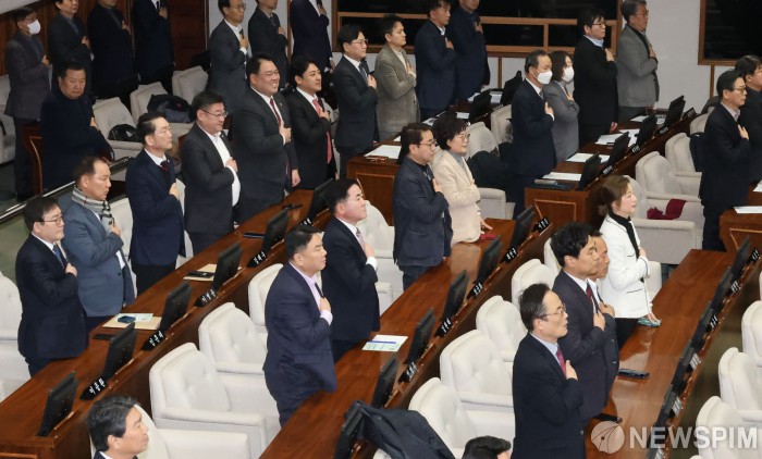 [서울=뉴스핌] 양윤모 기자 = 오세훈 서울시장과 정근식 서울시교육감이 참석한 가운데, 18일 오후 서울시의회 본회의장에서 개최된 '제328회 시의회 임시회 개회식'에 참석한 의원들이 국민의례를 하고 있다. 2025.02.18 yym58@newspim.com