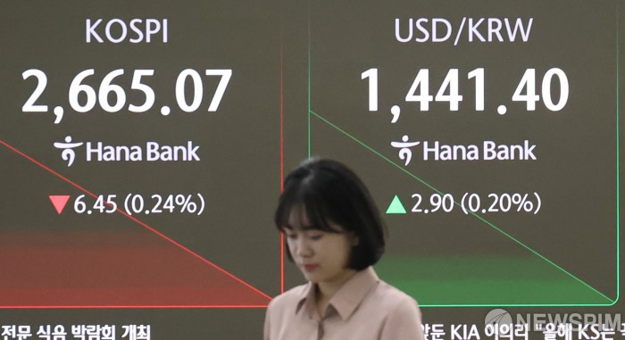 [서울=뉴스핌] 양윤모 기자 = 20일 오전 코스피 지수가 전 거래일 종가보다 6.45포인트(0.24%) 내린 2,665.07로, 코스닥 지수는 1.97포인트(0.25%) 오른 780.24로 거래를 시작했다. 서울 외환시장에서 원/달러 환율은 전 거래일보다 2.90원 오른 1,441.40원에 거래되는 가운데, 서울 중구 하나은행 딜링룸에서 직원들이 업무를 보고 있다. 2025.02.20 yym58@newspim.com