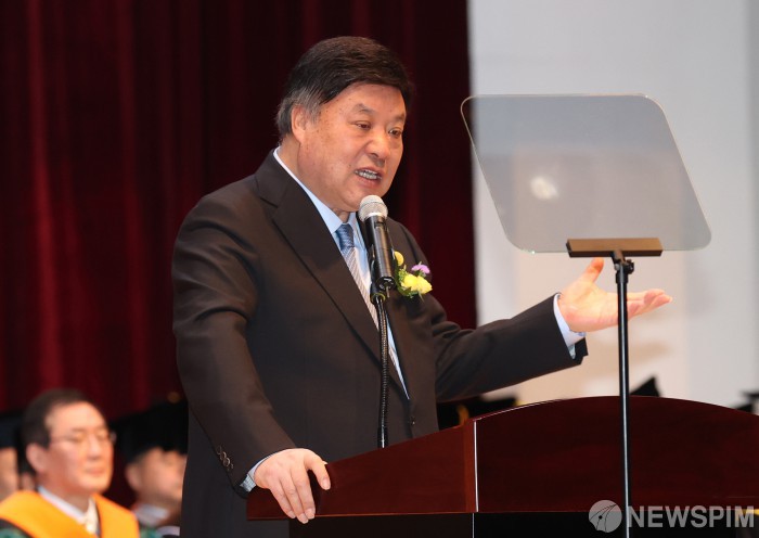 [서울=뉴스핌] 이호형 기자 = 서정진 셀트리온 회장이 21일 오전 서울 건국대 서울캠퍼스 새천년관 대공연장에서 열린 제137회 학위수여식에서 축사를 하고 있다. 한편 서 회장은 건국대 산업공학과를 졸업하고 동 산업대학원에서 석사 학위를 받았다. 또한 지난해 10월에는 ‘원-헬스 클러스터 조성을 위한 건국발전기금’으로 10억원을 기부했다. 2025.02.21 leemario@newspim.com