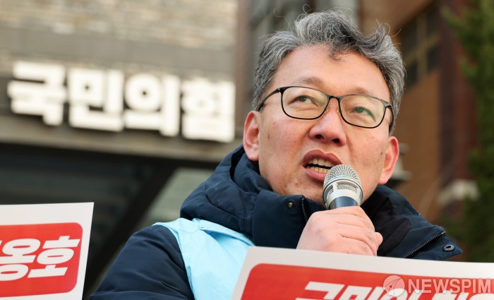 [서울=뉴스핌] 최지환 기자 = 김용연 진보당 서울시당 위원장이 21일 오후 서울 영등포구 국민의힘 당사 앞에서 열린 내란공범 국민의힘 해체의 날 기자회견에서 기자회견문을 낭독하고 있다. 2025.02.20 choipix16@newspim.com