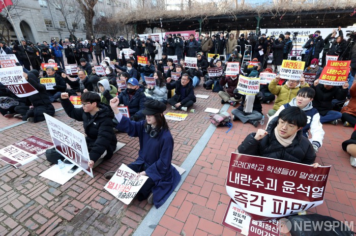 [서울=뉴스핌] 정일구 기자 = 21일 오후 서울 성북구 고려대학교에서 윤석열 퇴진 긴급 고려대 행동을 준비하는 학생들 주최로 열린 윤석열 대통령 퇴진 촉구 집회에서 참가자들이 구호를 외치고 있다. 2025.02.21 mironj19@newspim.com