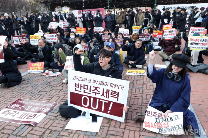 [서울=뉴스핌] 정일구 기자 = 21일 오후 서울 성북구 고려대학교에서 윤석열 퇴진 긴급 고려대 행동을 준비하는 학생들 주최로 열린 윤석열 대통령 퇴진 촉구 집회에서 참가자들이 구호를 외치고 있다. 2025.02.21 mironj19@newspim.com
