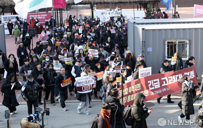 [서울=뉴스핌] 정일구 기자 = 21일 오후 서울 성북구 고려대학교에서 윤석열 퇴진 긴급 고려대 행동을 준비하는 학생들 주최로 열린 윤석열 대통령 퇴진 촉구 집회에서 참가자들이 행진하고 있다. 2025.02.21 mironj19@newspim.com