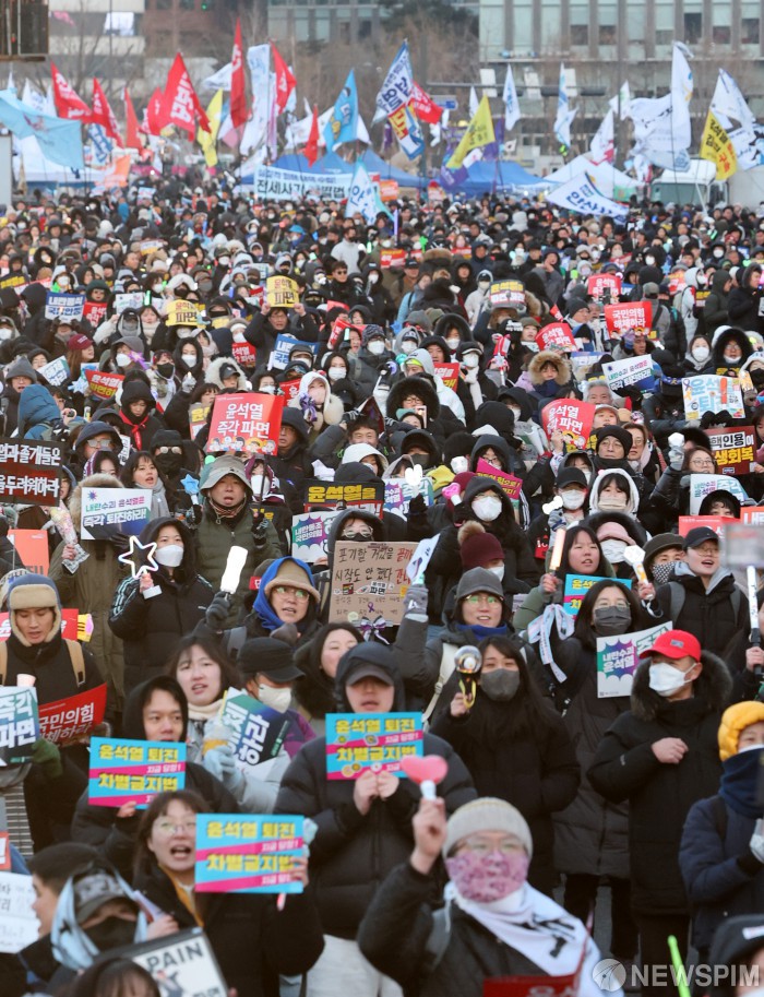 [서울=뉴스핌] 최지환 기자 = 윤석열 탄핵을 찬성하는 진보단체 회원들이 22일 오후 서울 종로구 경복궁 앞에서 '윤석열 즉각 퇴진! 사회대개혁! 12차 범시민 대행진'을 열고 있다. 2025.02.22 choipix16@newspim.com