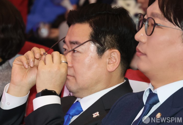 [서울=뉴스핌] 양윤모 기자 = 박찬대 더불어민주당 원내대표가 23일 오전 서울 여의도 국회 의원회관 대회의실에서 열린 '더불어민주당 전국청년위원회 발대식'에서 안경을 고쳐쓰고 있다. 이날 행사에는 진성준 더불어민주당 정책위의장,김병주 최고위원,모경종 전국청년위원회 위원장등이 참석했다. 2025.02.23 yym58@newspim.com