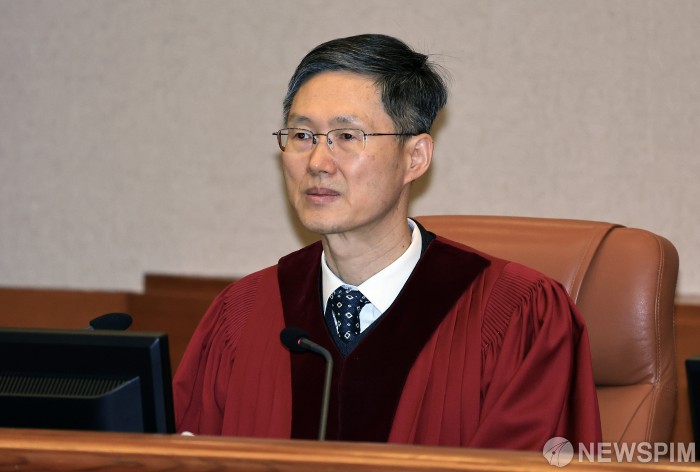 [서울=뉴스핌] 사진공동취재단 = 문형배 헌법재판소장 권한대행이 25일 오후 서울시 종로구 재동 헌법재판소 대심판정에서 열린 대통령 탄핵 심판 11차 변론에 착석해 있다. 2025.02.25 photo@newspim.com