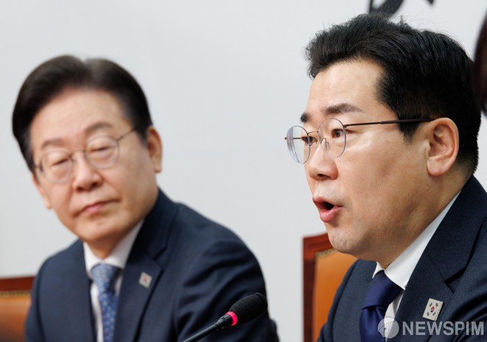 [서울=뉴스핌] 윤창빈 기자 = 박찬대 더불어민주당 원내대표가 26일 오전 서울 여의도 국회에서 열린 최고위원회의에서 모두발언을 하고 있다. 2025.02.26 pangbin@newspim.com