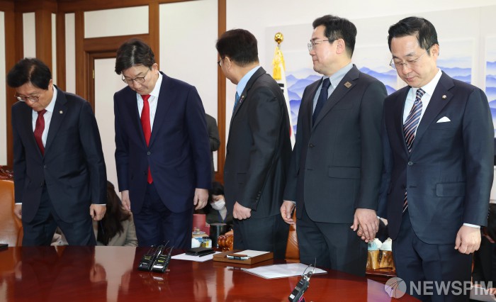 [서울=뉴스핌] 윤창빈 기자 = 우원식 국회의장과 양당 원내대표가 26일 오전 서울 여의도 국회에서 의장주재로 열린 원내대표 회동에서 기념촬영을 마치고 자리라 향하고 있다. 왼쪽부터 박형수 국민의힘 원내수석부대표, 권성동 국민의힘 원내대표와 우원식 국회의장, 박찬대 더불어민주당 원내대표, 박성준 더불어민주당 원내수석부대표. 2025.02.26 pangbin@newspim.com