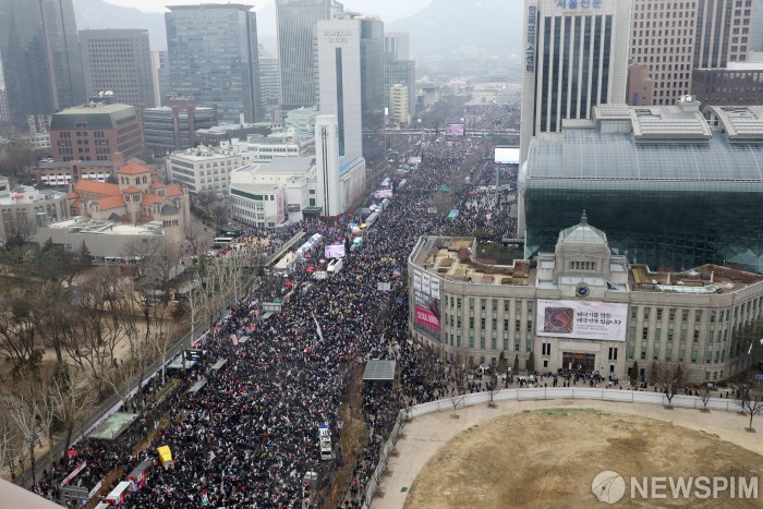 [서울=뉴스핌] 정일구 기자 = 1일 오후 서울 중구 세종대로 일대에서 대한민국바로세우기국민운동본부(대국본) 주최로 자유통일을 위한 국민대회가 열리고 있다. 2025.03.01 mironj19@newspim.com