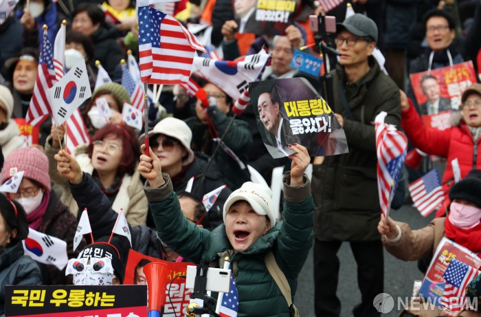[서울=뉴스핌] 정일구 기자 = 대한민국바로세우기국민운동본부(대국본) 등 관계자들이 1일 오후 서울 중구 세종대로 일대에서 열린 자유통일을 위한 국민대회에서 구호를 외치고 있다. 2025.03.01 mironj19@newspim.com