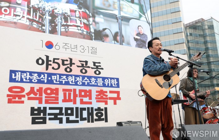 [서울=뉴스핌] 정일구 기자 = 가수 강산에가 1일 오후 서울 종로구 안국동 사거리에서 야5당 공동 내란종식·민주헌정수호를 위한 윤석열 파면 촉구 범국민대회에서 공연을 선보이고 있다. 2025.03.01 mironj19@newspim.com
