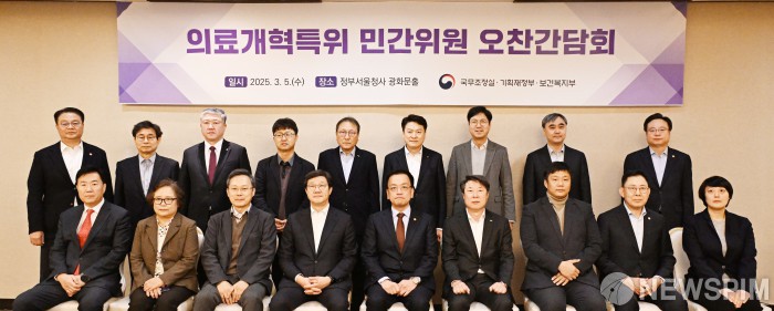 [서울=뉴스핌] 최상목 대통령 권한대행 부총리 겸 기획재정부 장관이 5일 서울 종로구 정부서울청사에서 대통령 직속 의료개혁특별위원회 노연홍 위원장 등 민간위원들과의 오찬간담회에서 기념촬영을 하고 있다. [사진=기획재정부] 2025.03.05 photo@newspim.com