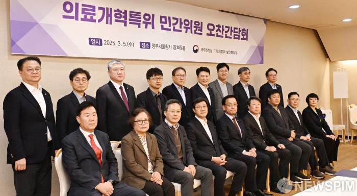 [서울=뉴스핌] 최상목 대통령 권한대행 부총리 겸 기획재정부 장관이 5일 서울 종로구 정부서울청사에서 대통령 직속 의료개혁특별위원회 노연홍 위원장 등 민간위원들과의 오찬간담회에서 기념촬영을 하고 있다. [사진=기획재정부] 2025.03.05 photo@newspim.com