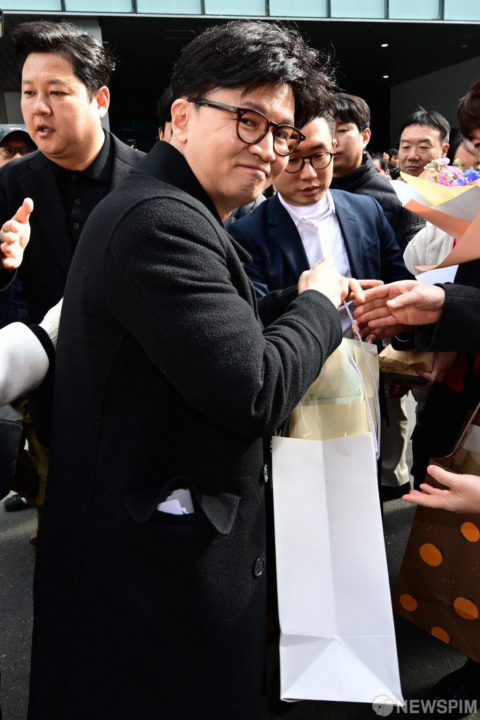 [서울=뉴스핌] 정일구 기자 = 한동훈 전 국민의힘 대표가 5일 오후 서울 마포구 청년문화공간JU에서 열린 '한동훈의 선택, 국민이 먼저입니다' 북콘서트에 참석하며 지지자들의 꽃다발을 받고 있다. 2025.03.05 mironj19@newspim.com
