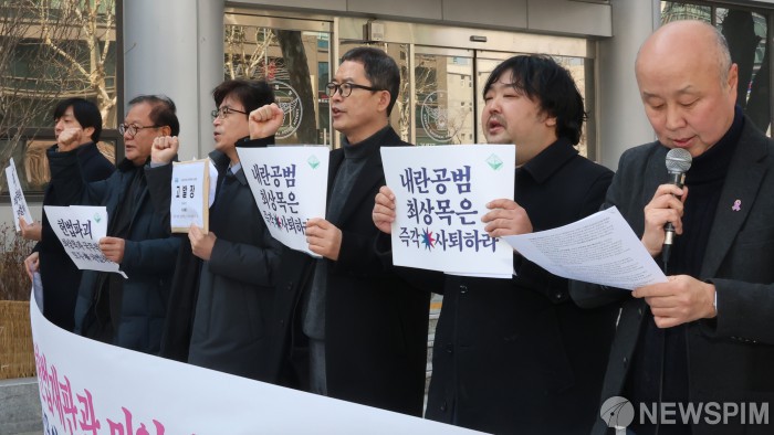[서울=뉴스핌] 양윤모 기자 = 윤석열즉각퇴진·사회대개혁 비상행동이 6일 오후 서대문 경찰청 국가수사본부 앞에서 '헌법재판관 미임명' 최상목 대통령 권한대행과 국무위원 직무유기 고발 기자회견중 구호를 외치고 있다. 같은시간 최 권한대행은 경찰청에서 '민생범죄 점검회의'를 주재 했다. 2025.03.06 yym58@newspim.com