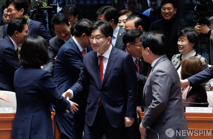[서울=뉴스핌] 윤창빈 기자 = 권성동 국민의힘 원내대표와 소속 의원들이 11일 오전 서울 여의도 국회에서 열린 의원총회에 참석하고 있다. 2025.03.11 pangbin@newspim.com
