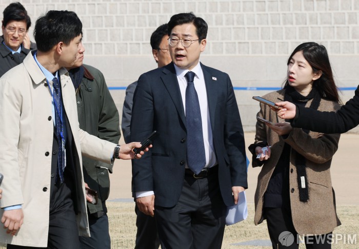 [서울=뉴스핌] 김학선 기자 = 더불어민주당 박찬대 원내대표가 14일 서울 광화문 앞에서 열린 최고위원회의에 참석하며 취재진의 질문에 답하고 있다. 2025.03.14 yooksa@newspim.com
