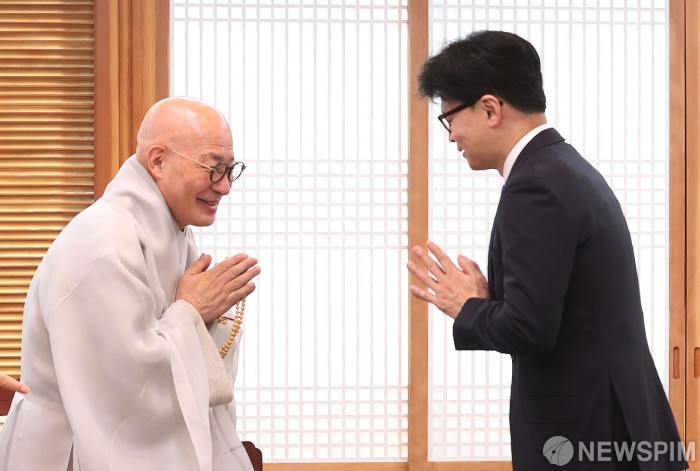 [서울=뉴스핌] 이호형 기자 = 한동훈 전 국민의힘 대표가 17일 오전 서울 종로구 한국불교역사 문화기념관에서 조계종 총무원장 진우스님을 예방하고 있다. 2025.03.17 leemario@newspim.com