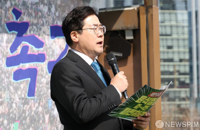 [서울=뉴스핌] 정일구 기자 = 박찬대 더불어민주당 원내대표가 17일 오후 서울 종로구 광화문광장에서 열린 윤석열 즉각 파면 촉구 각계 긴급시국선언 기자회견에서 발언하고 있다. 2025.03.17 mironj19@newspim.com
