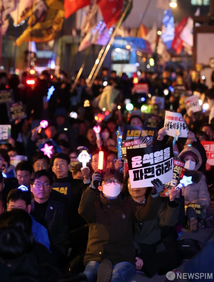 [서울=뉴스핌] 최지환 기자 = 20일 오후 서울 종로구 동십자각 앞에서 열린 '내란수괴 윤석열 즉각 파면 긴급행동'에서 박찬대 더불어민주당 원내대표를 비롯한 참석자들이 구호를 외치고 있다. 2025.03.20 choipix16@newspim.com
