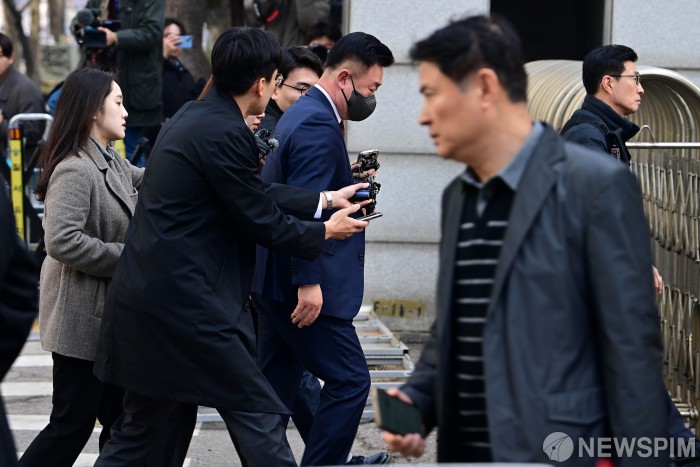 [서울=뉴스핌] 양윤모 기자 = 윤석열 대통령 체포영장 집행 방해 혐의를 받는 이광우 경호본부장이 21일 서울 마포구 서울서부지방법원에서 열린 영장실질심사에 출석하고 있다. 2025.03.21 yym58@newspim.com
