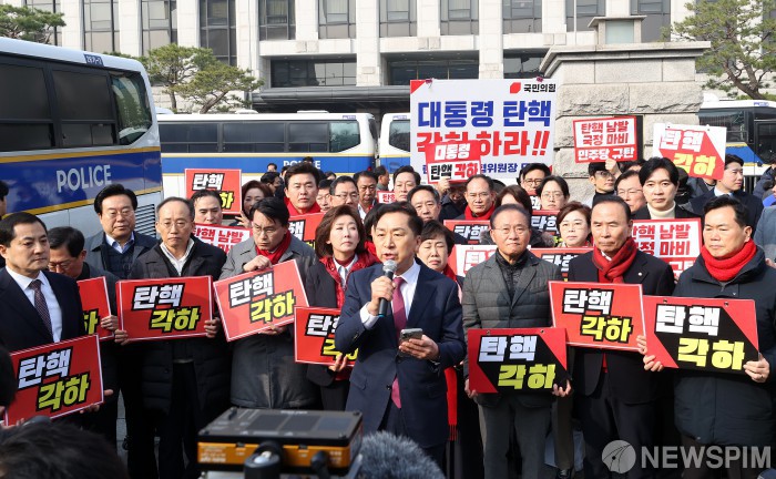 [서울=뉴스핌] 정일구 기자 = 국민의힘 의원들이 21일 오전 서울 종로구 헌법재판소 앞에서 윤석열 대통령 탄핵 각하 촉구 기자회견을 하고 있다. 2025.03.21 mironj19@newspim.com