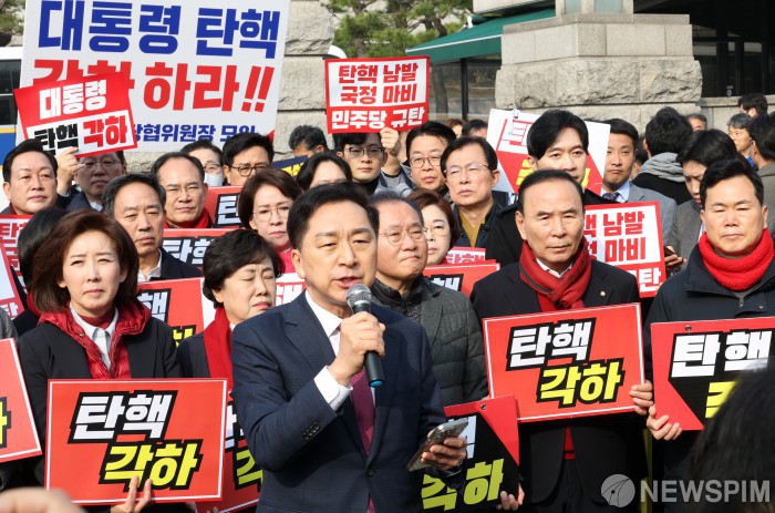 [서울=뉴스핌] 정일구 기자 = 김기현 국민의힘 의원이 21일 오전 서울 종로구 헌법재판소 앞에서 열린 윤석열 대통령 탄핵 각하 촉구 기자회견에서 발언을 하고 있다. 2025.03.21 mironj19@newspim.com
