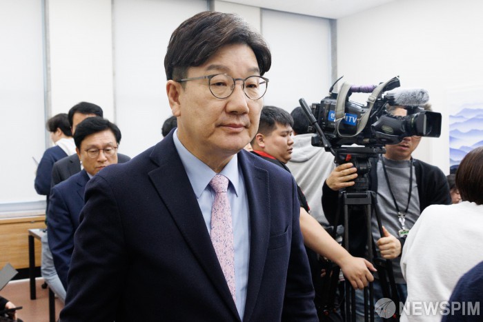 [서울=뉴스핌] 윤창빈 기자 = 권성동 국민의힘 원내대표가 21일 오후 서울 여의도 국회에서 현안관련 기자간담회에 참석하고 있다. 2025.03.21 pangbin@newspim.com
