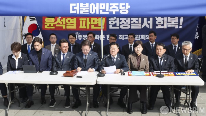[서울=뉴스핌] 양윤모 기자 = 더불어민주당 이재명 대표와 박찬대 원내대표 등 최고위원들이 24일 오전 서울 광화문 앞 천막당사에서 최고위원회의를 하고 있다. [공동취재] 2025.03.24 yym58@newspim.com