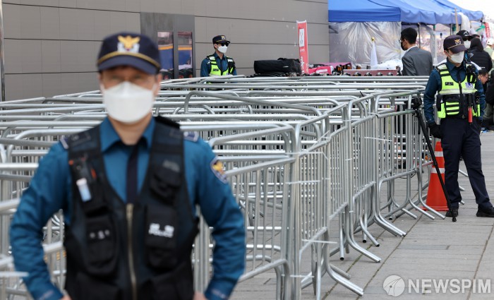 [서울=뉴스핌] 최지환 기자 = 윤석열 대통령이 국회에서 탄핵 소추된 지 100일째인 24일 오후 서울 종로구 헌법재판소 앞에 경찰이 경계근무를 서고 있다. 2025.03.24 choipix16@newspim.com