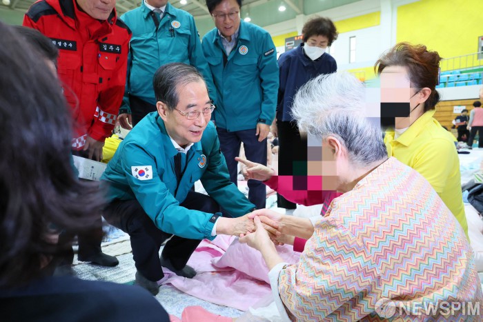 [서울=뉴스핌]한덕수 대통령 권한대행 국무총리가 24일 오후, 경북 의성군 의성체육관에 마련된 주민대피소를 방문하여 대피 주민들을 위로하고 있다.[사진=총리실] 2025.03.24 photo@newspim.com