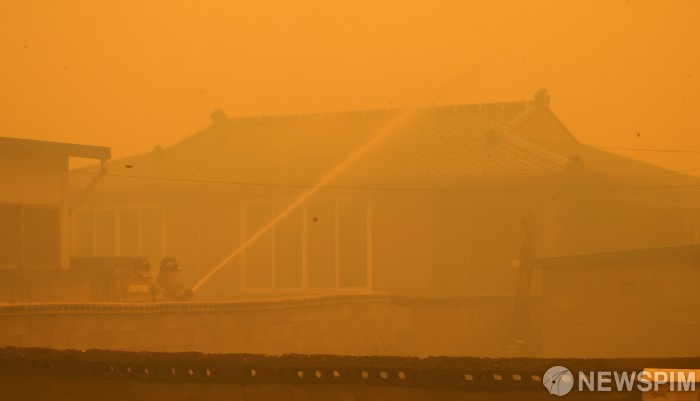 [안동=뉴스핌] 정일구 기자 = 경북 의성에서 시작된 산불이 안동으로 번진 가운데 25일 오후 경북 안동시 길안면 백자리에서 소방대원이 크게 확산된 산불을 진화하고 있다. 2025.03.25 mironj19@newspim.com