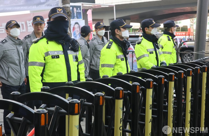 [서울=뉴스핌] 양윤모 기자 = 윤석열 대통령의 정치적 운명이 결정되는 4일 윤 대통령 지지자들이 이른 아침 한남동 대통령 관저 앞에서 헌법재판소의 '탄핵소추 기각'을 주장하는 집회를 준비하는 가운데,경찰들이 사고에 대비하고 있다. 2025.04.04 yym58@newspim.com