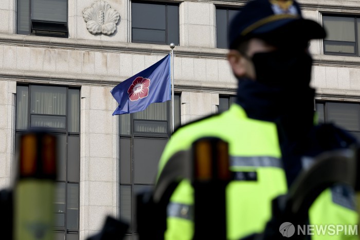 [서울=뉴스핌] 사진공동취재단 = 윤석열 대통령 탄핵 심판 선고일인 4일 오전 서울 종로구 헌법재판소 정문에서 경찰 병력이 출입을 통제하고 있다. 2025.04.04 photo@newspim.com
