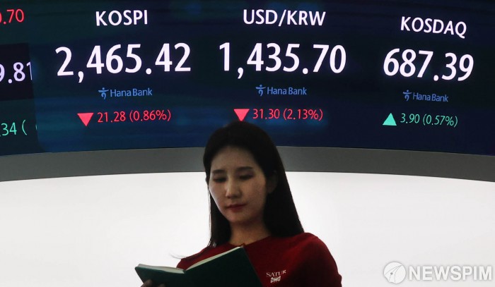 [서울=뉴스핌] 양윤모 기자 = 헌법재판소의 윤석열 대통령 탄핵이 확정된 4일 오후 코스피 지수가 전 거래일 종가보다 21.28포인트(0.86%) 내린 2,465.42로, 코스닥 지수는 3.90포인트(0.57%) 오른 687.39로 거래를 마감했다. 서울 외환시장에서 원/달러 환율은 전 거래일보다 31.30원 내린 1,435.70원에 거래되는 가운데, 서울 중구 하나은행 딜링룸에서 직원들이 업무를 보고 있다. 2025.04.04 yym58@newspim.com