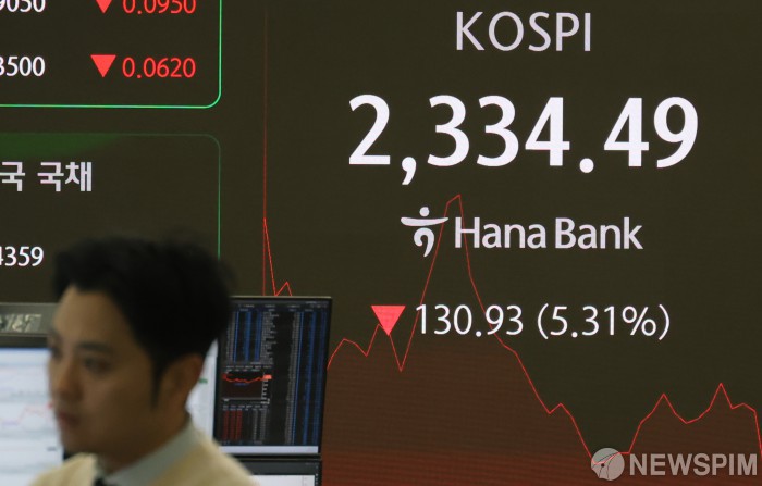 [서울=뉴스핌] 양윤모 기자 = 계속되는 ‘美관세 쇼크'로 7일 오전 코스피 지수가 전 거래일 종가보다 130.93포인트(5.32%) 내린 2,334.49로, 코스닥 지수는 28.43포인트(4.21%) 내린 658.43으로 거래를 시작했다. 서울 외환시장에서 원/달러 환율은 전 거래일보다 35.90원 오른 1,470.00원에 거래되는 가운데, 서울 중구 하나은행 딜링룸에서 직원들이 업무를 보고 있다. 2025.04.07 yym58@newspim.com