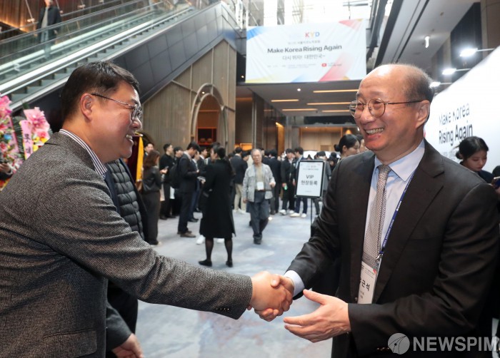 [서울=뉴스핌] 최지환 기자 = 유근석 뉴스핌 대표이사가 8일 오전 서울 여의도 페어몬트호텔 그랜드볼룸에서 종합뉴스통신사 뉴스핌 주최로 열린 제13회 서울이코노믹포럼 행사장에서 참석자들과 인사를 나누고 있다. 'Make Korea Rising Again : 다시 뛰자! 대한민국'이라는 주제로 열린 이번 포럼은 보수와 진보로 나뉘어 극심한 분열 양상을 보이고 있는 우리 사회의 '통합'을 모색하기 위해 마련됐다. 2025.04.08 choipix16@newspim.com